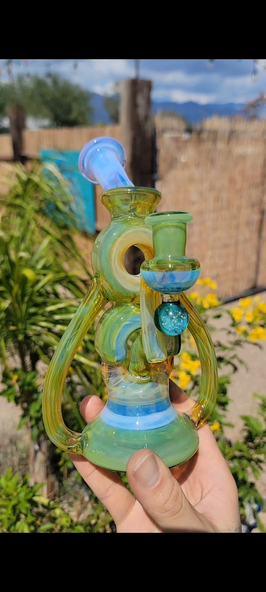 “I call this design mooncyclers its a full donut to half donut uptakes with bubble drains down each side. This was a full color version that really tested my capabilities and I’m very proud to show it!” - Howls Glass